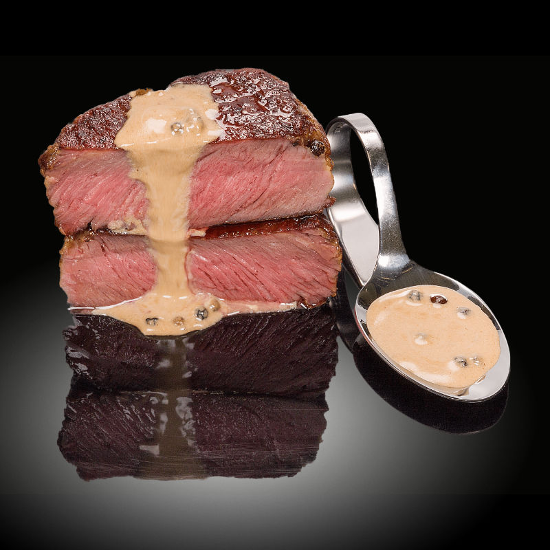 Крехко телешко месо, приготвено до съвършенство и поднесено с пепърен сос, който допълва вкуса с богати аромати и пикантност.